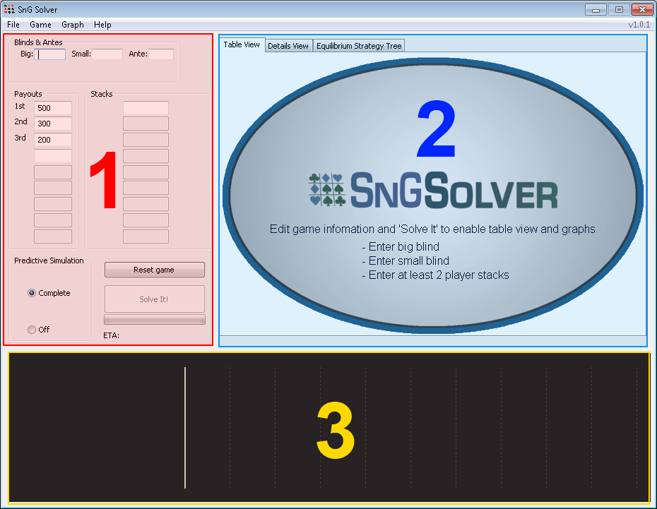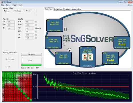 - Complete - In this mode SnG Solver uses the Predictive Simulation Model (PSM) to consider every possible outcome of the future round of play to calculate the most accurate equity estimations and strategy analysis possible. It is this mode that sets SnG Solver apart from other tournament equity/strategy calculators.