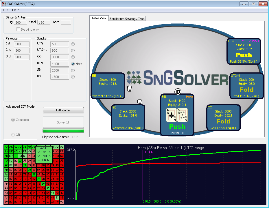 SnG Solver is an equity calculator and pre-flop strategy analyzer for single-table poker tournaments (a.k.a. Sit 'n Gos) and the final tables of larger multi-table tournaments.Poker is getting tougher and tougher as players become more educated. Whether you're a high-stakes pro or are brand new to the game, you need find a way to get an edge on your opponents.